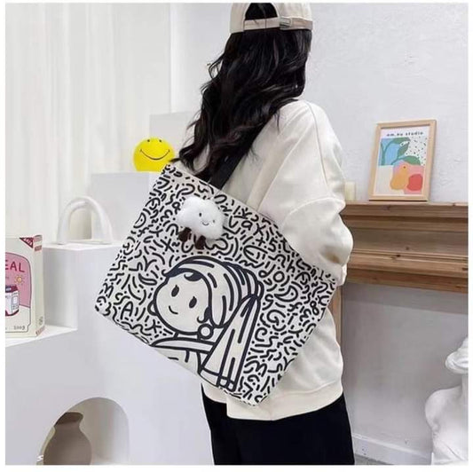 C080, 2024 new canvas bag niche ins shoulder bag cartoon bag commuter bag large capacity handbag Size:32* 32cm