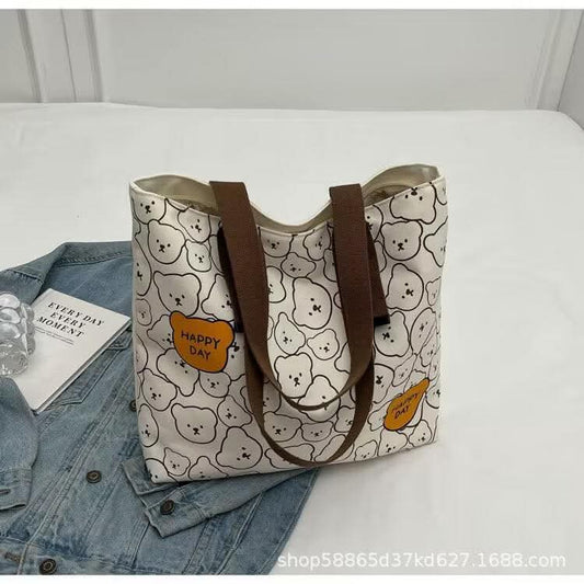 C98, New Tote Bag Female College Students Early Eight Commuter Canvas Bag Large Capacity Tote Bag Cute Bear Underarm Bag