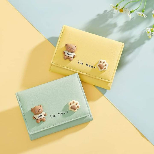 w030, short leather wallet, foldable, bear pattern, cute for girls and students.